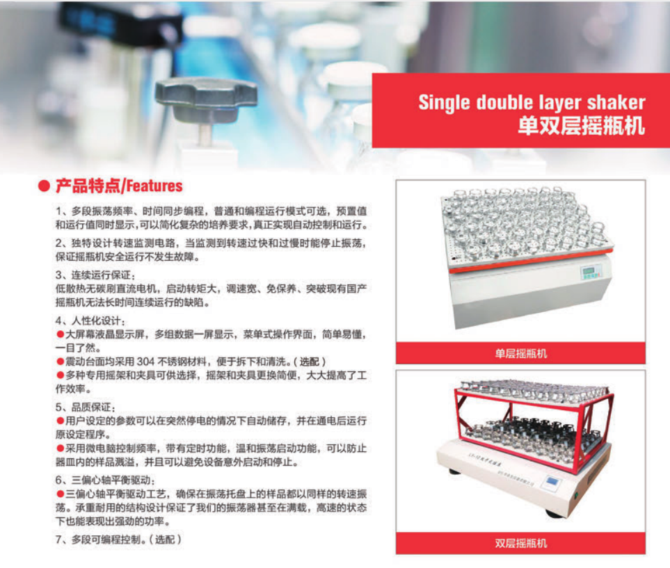 單雙層搖瓶機廣泛應用于制藥行業的細菌培養、發酵、雜交和生物化學反應以及酶、細胞組織研究等。在醫學、生物學、分子學、制藥、食品、環保等研究應用領域有著廣泛而重要的應用。